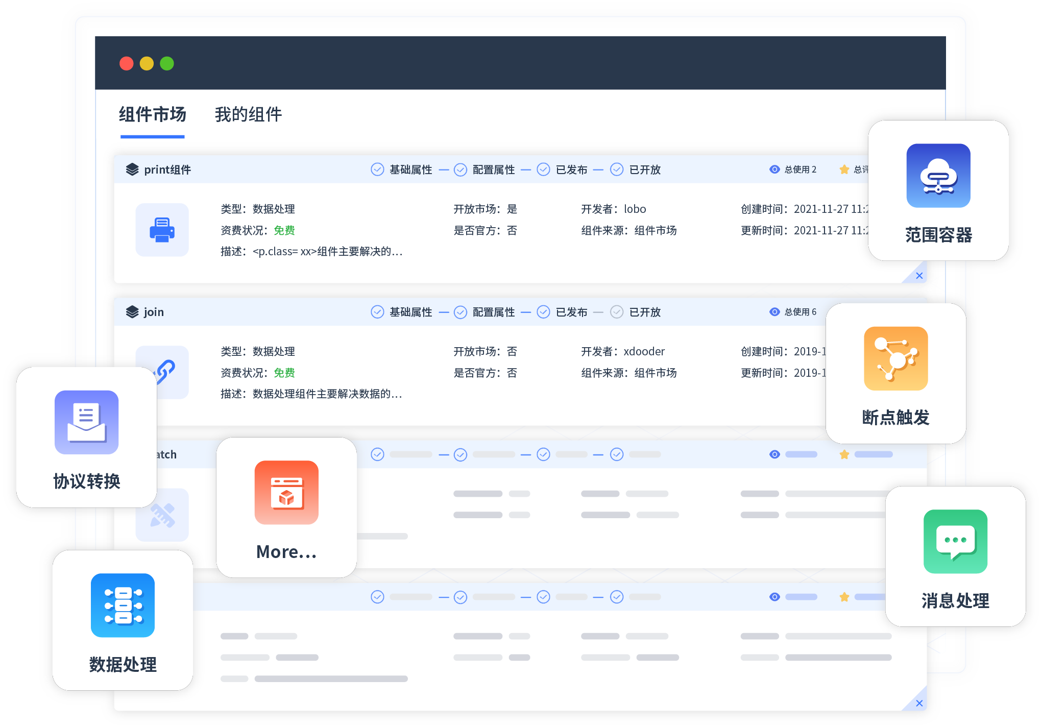 针对集成场景,97国际至尊提供组件市场,例如协议转换、消息处理、文件操作等。除平台提供的组件外,客户可以自定义所需组件。